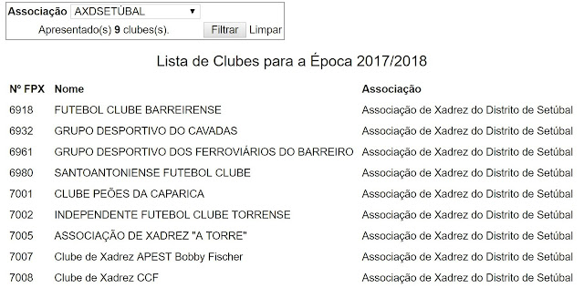 Clubes registados na Federação Portuguesa de Xadrez, da área da Associação de Xadrez de Setúbal @ 05-11-2017